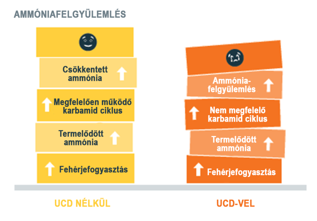 Ez a folyamat hulladékot termel, amitől a szervezet ennek megfelelően megszabadul. A fehérjék lebomlásakor szervezetében ammónia termelődik. Egy UCD nélküli ember esetében az ammónia az úgynevezett „karbamidciklus” segítségével távozik a szervezetből. Ha Önnek UCD-je van, akkor a karbamidciklus valamelyik lépése nem működik, és a szervezete nem képes megszabadulni az ammóniától. Az ammónia ezután felhalmozódik, ami káros lehet.